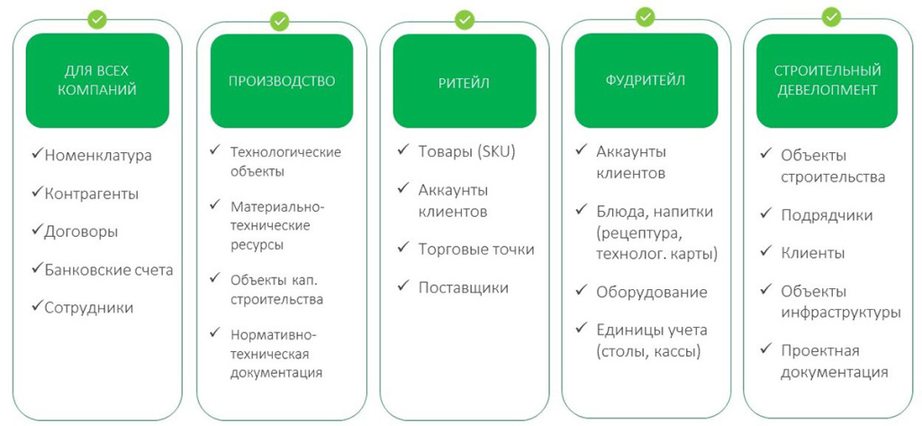 Для разных отраслей основные данные могут отличаться и иметь разную степень влияния на бизнес. Например, для ритейла самым объемным и важным справочником является справочник «Товары (SKU)» – от ошибок в нем зависит логистика, излишки или недостатки складских запасов, риски потери товаров в связи с истечением сроков годности. А для телекома большее значение будет иметь справочник клиентов.