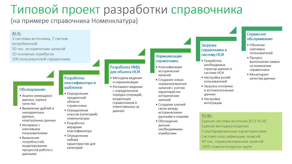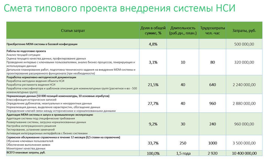 Рассматриваем проект продолжительностью 1,5 года. Полгода – период аудита и описания текущих процессов, разработки структуры и хранения данных, создания методической документации нормализации справочников и запуск системы в промышленную эксплуатацию. Еще год – сервисное обслуживание справочника для обеспечения обучения пользователей, мониторинга качества и выполнения заявок.