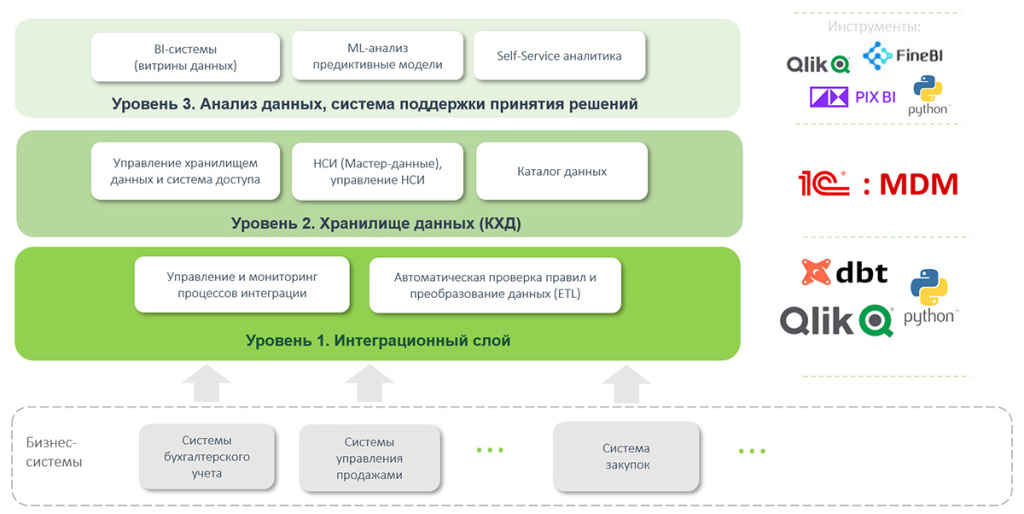 На третьем слое находятся BI-инструменты, в том числе self-service, инструменты ML-анализа. Главная цель сбора данных – их дальнейший анализ для извлечения ценности: принятия верных управленческих решений, получения инсайтов для развития бизнеса. Чтобы результаты анализа были корректны, важно, чтобы данные «на вход» были чистыми. За это во многом отвечает система НСИ.